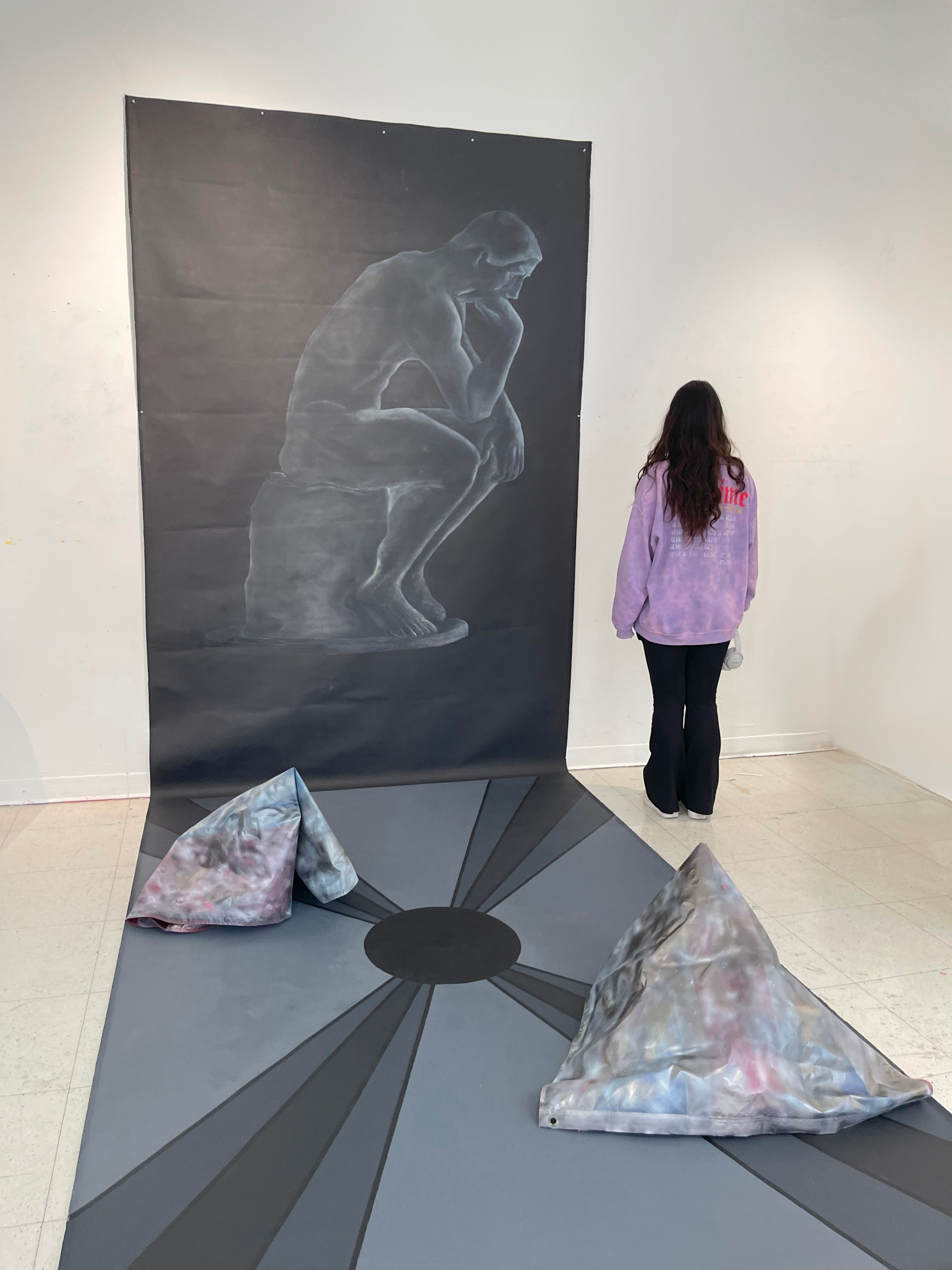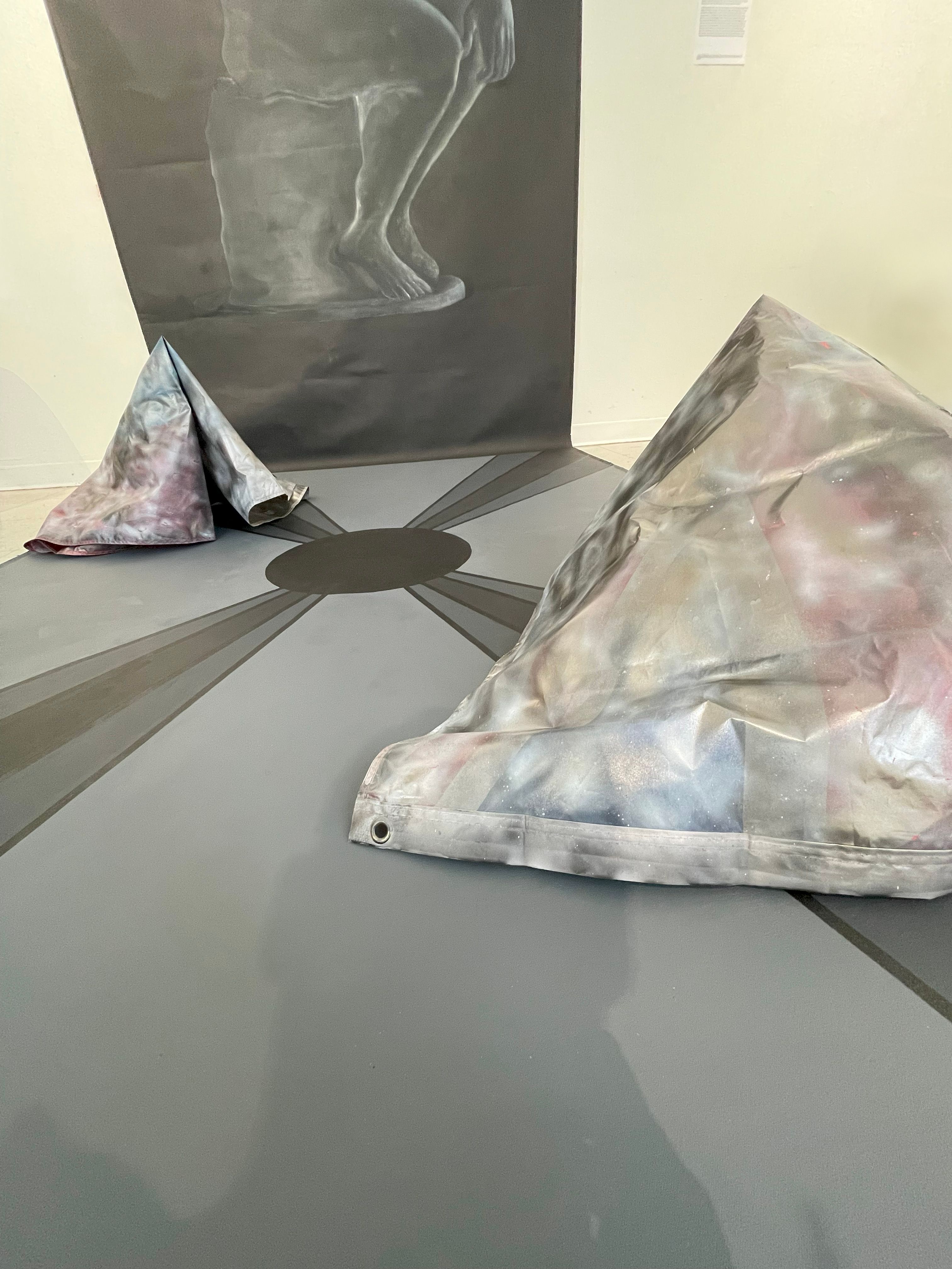 Charcoal, chalk, lead pencil, pastel, acrylic paint and spray paint on canvas and polyester filament